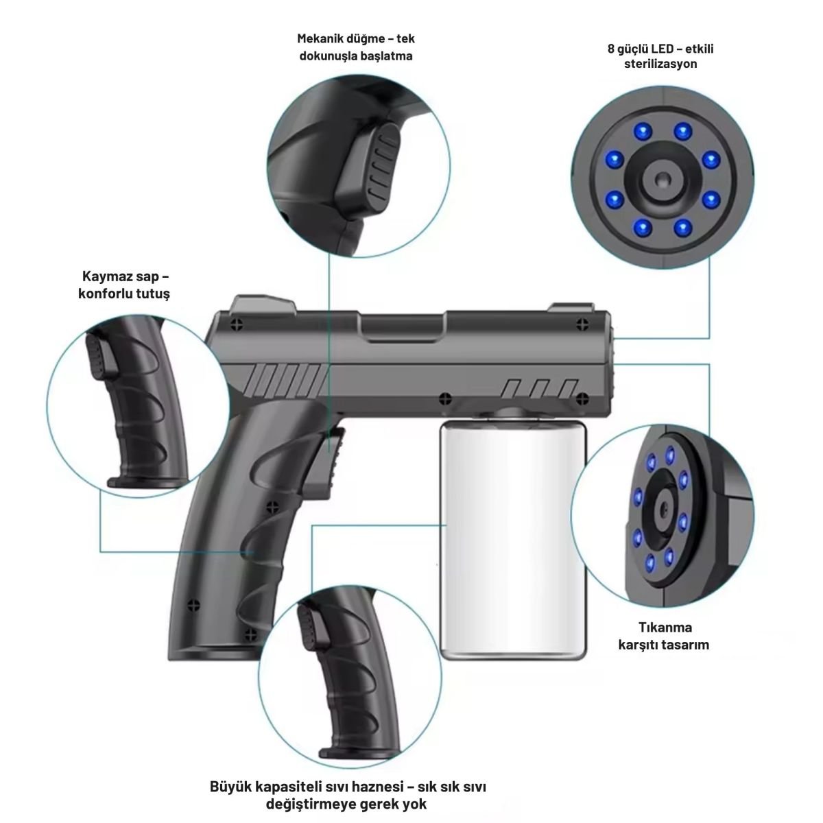 • YARDIMCI MAVİ LED HALKASI: Püskürtme alanını görsel olarak aydınlatır; karanlık ortamlarda kullanım konforu.