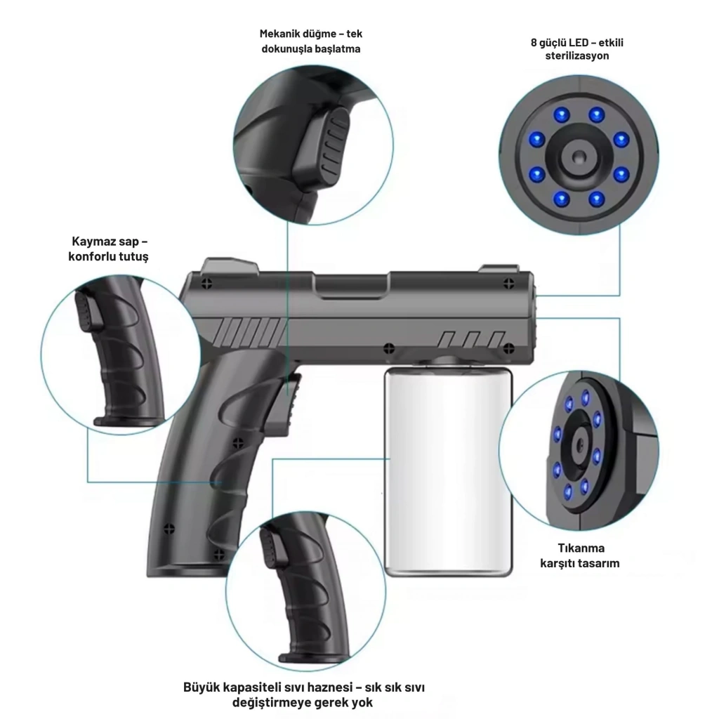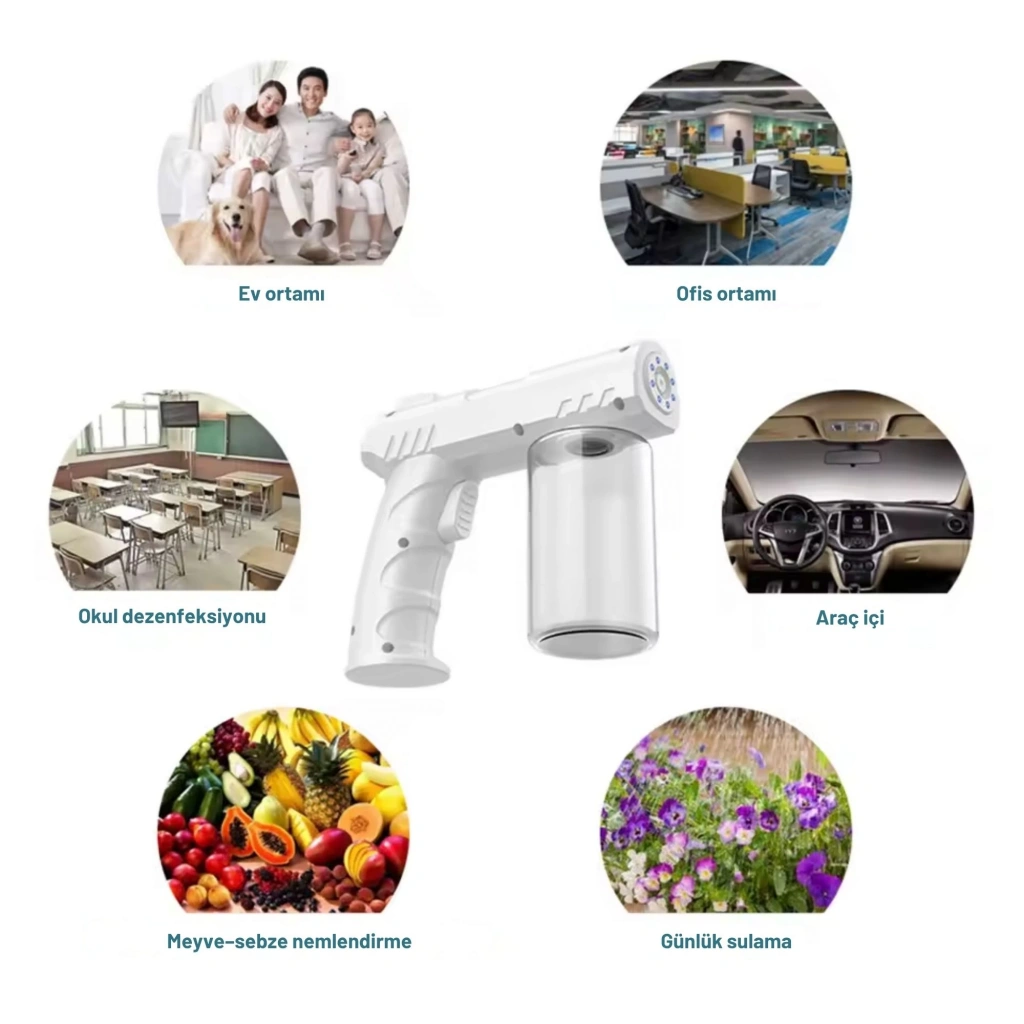 SHOPYTECH 280 ml Nano Mavi Işıklı Şarjlı Sprey Tabancası – Kablosuz Atomizer İnce Sis & 1–1.5 m Menzil USB Şarjlı SHOPYTECH nano sprey tabancası; ev, ofis, araç içi, okul, kuaför ve bahçede geniş alanları kısa sürede nemlendirmek ve püskürtmek için tasarlanmış taşınabilir bir atomizerdir. 280 ml haznesiyle sık sık doldurma gerektirmez; düşük sıcaklıkta ince sis üretir, ayarlanabilir püskürtme ile eşit kaplama sağlar. Ergonomik tabanca tutuşu tek tuşla kontrol, USB üzerinden şarj ve yardımcı mavi LED’lerle pratik bir kullanım sunar. • İNCE SİS & UZUN MENZİL: Düşük sıcaklıklı atomizasyon, homojen ve ince zerrecikli sis; 1–1.5 m’ye kadar etkili püskürtme.