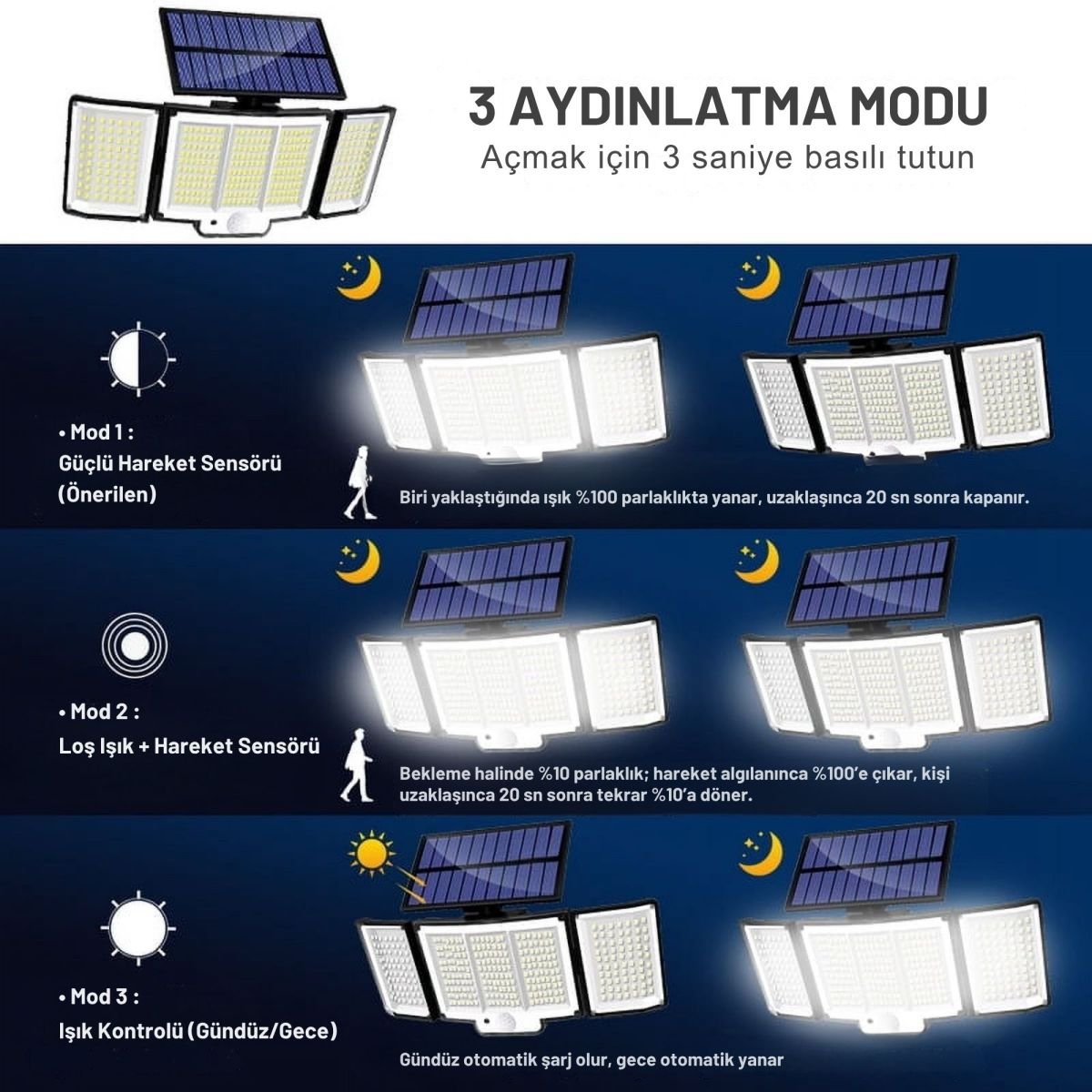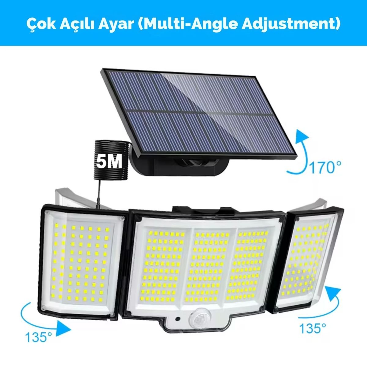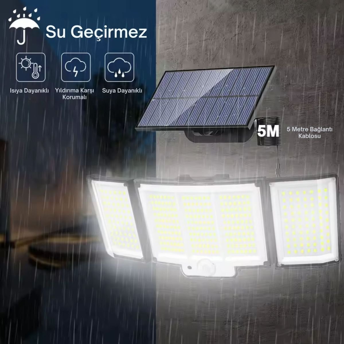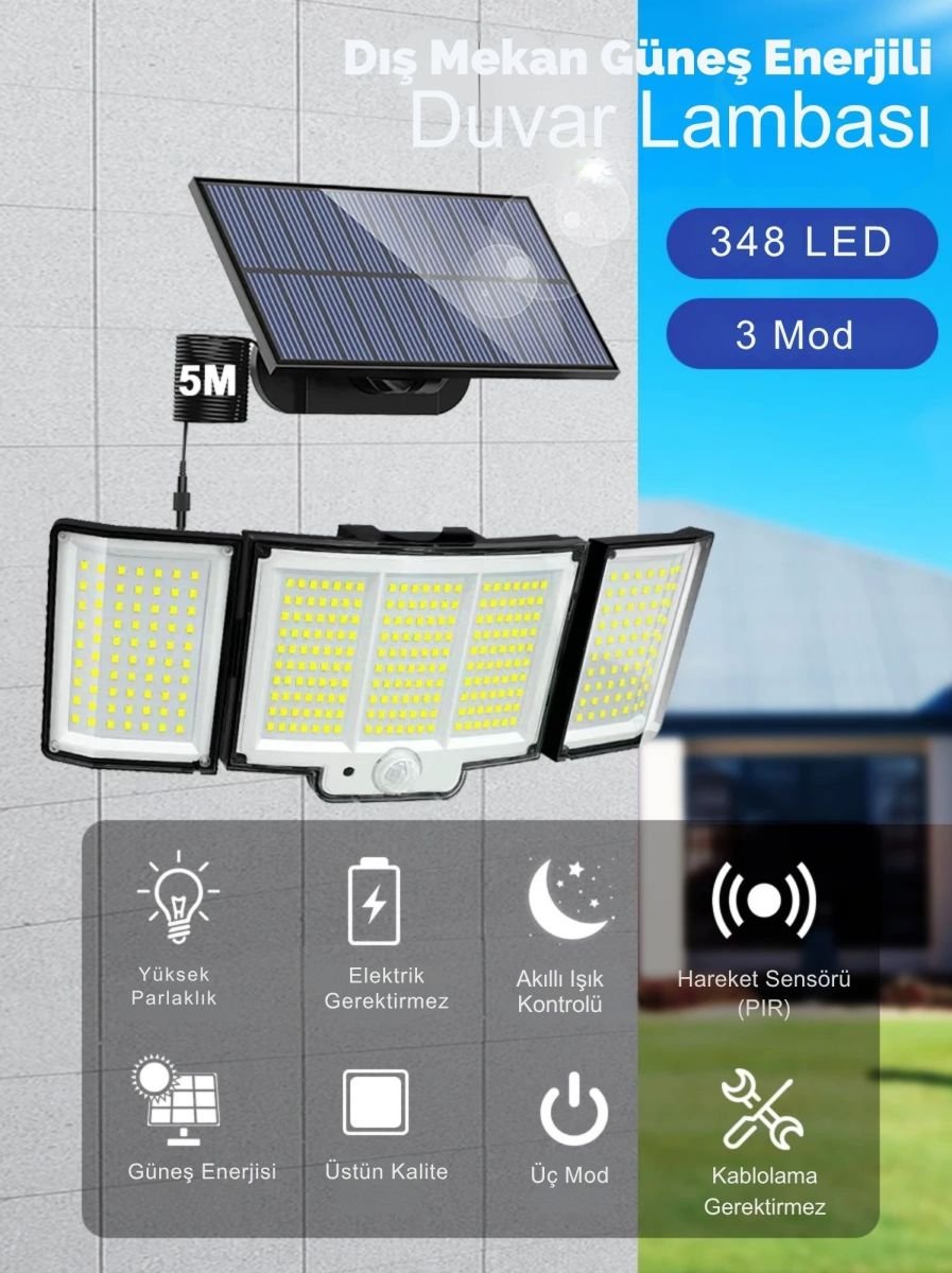 SHOPYTECH 348 LED Güneş Enerjili Dış Mekan Duvar Lambası IP65 Hareket Sensörü 3 Mod 5m Kablo • ULTRA PARLAK 348 LED: Üç başlıklı entegre tasarım; geniş alanı homojen aydınlatır. Bahçe, garaj, bina girişi, veranda, site yolları için ideal.