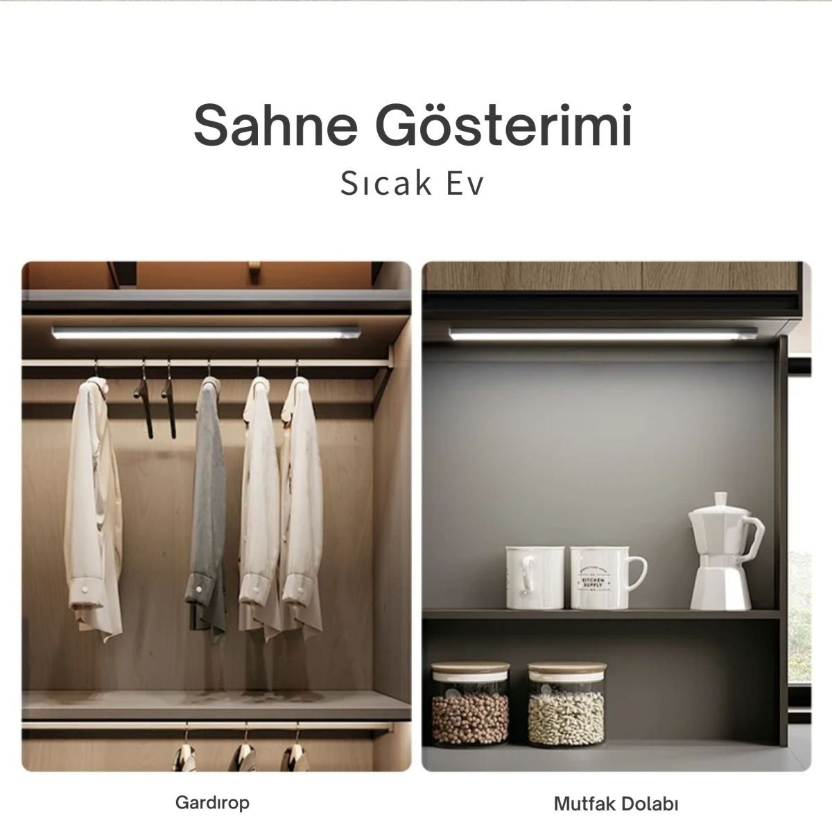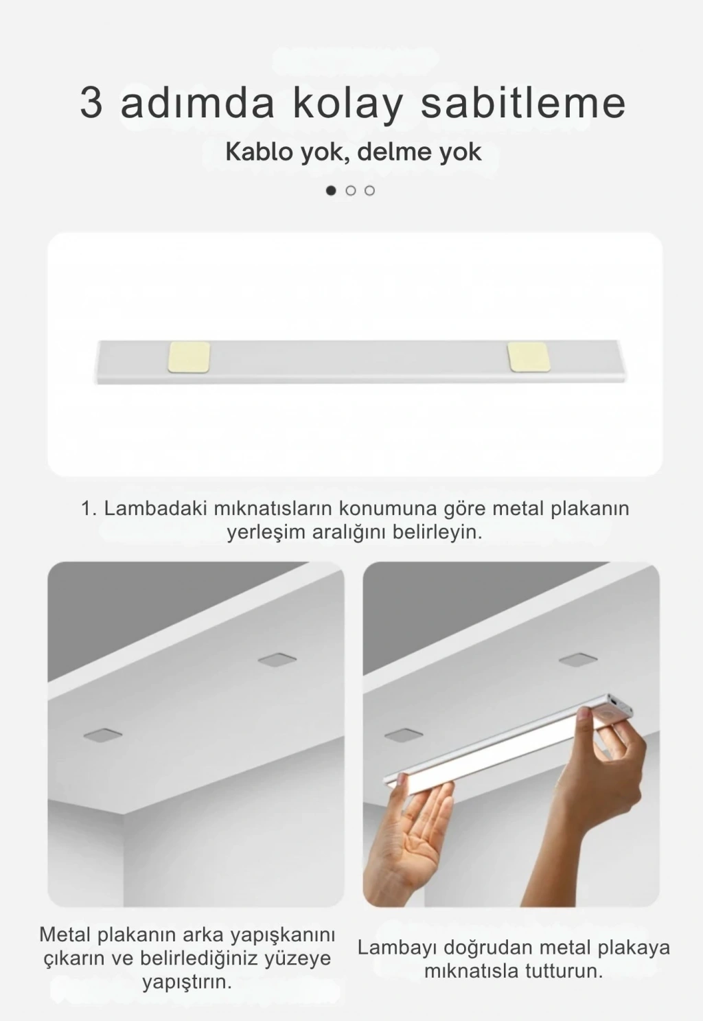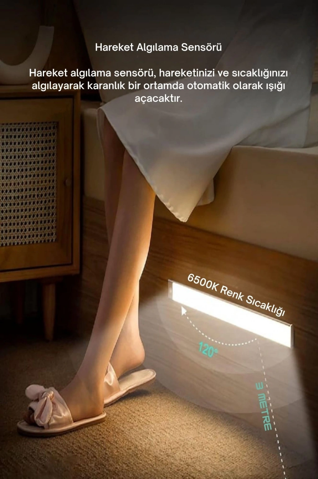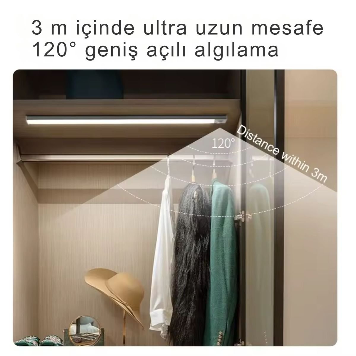 SHOPYTECH 50 cm Manyetik Şarjlı LED Dolap/Tezgâh Altı Lamba Hareket Sensörlü 3 Renk Kısılabilir USB Type-C • AKILLI HAREKET SENSÖRÜ: PIR sensör 120° açı ve 3 m mesafede hareketi algılar, 20 sn sonra otomatik kapanır. Auto modunda yalnızca karanlıkta yanar; gündüz gereksiz yere tetiklenmez.
