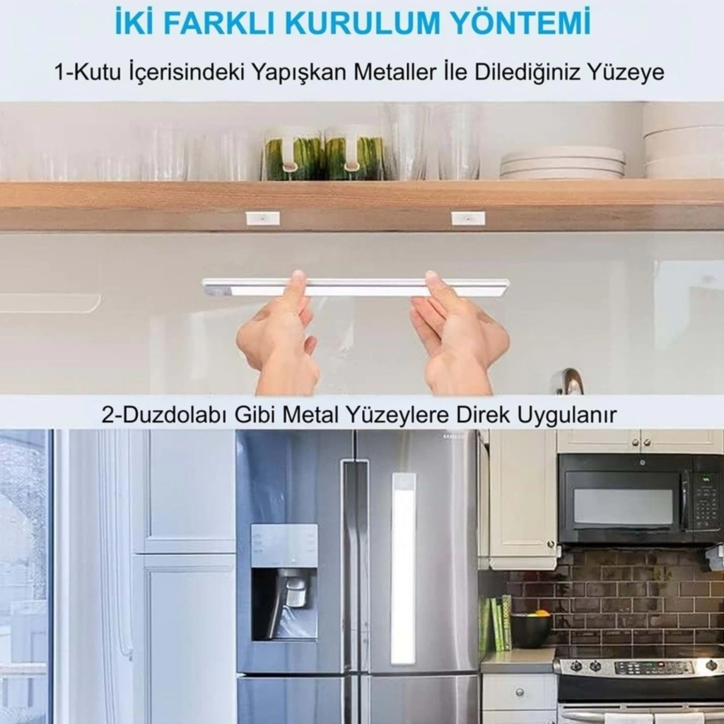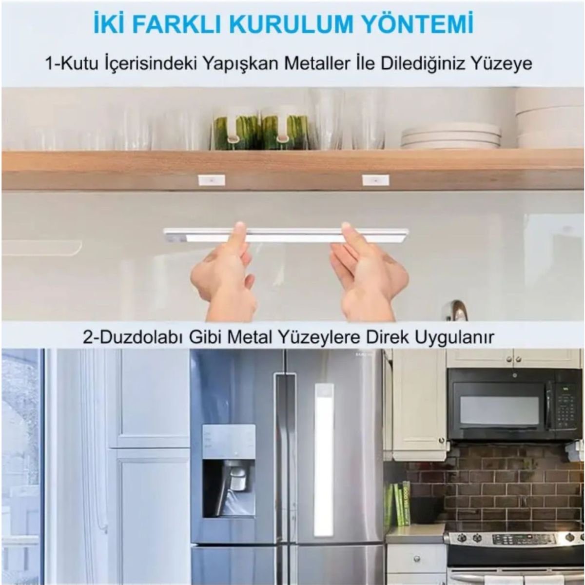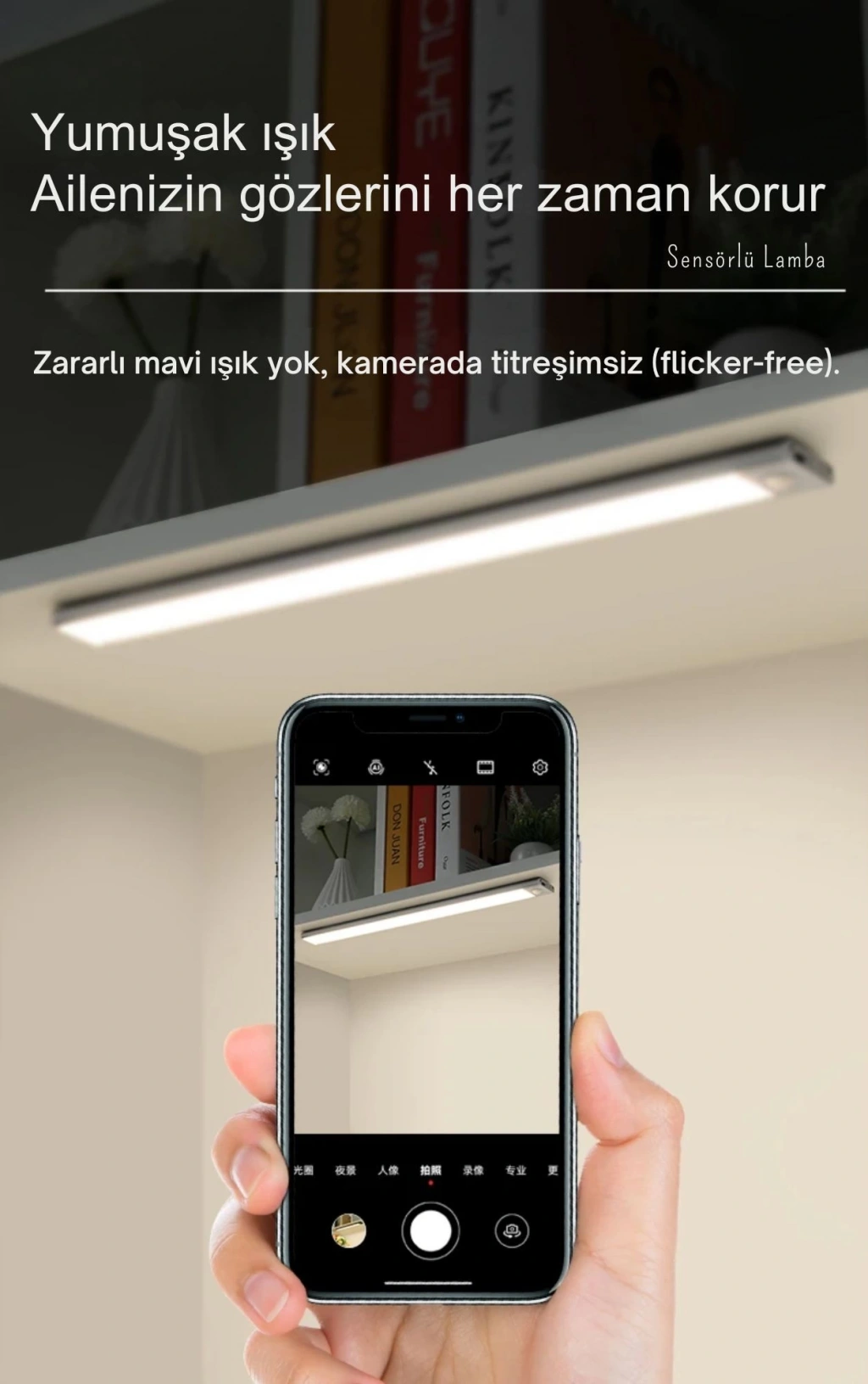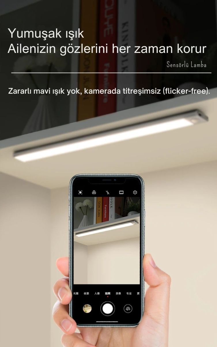SHOPYTECH 50 cm Manyetik Şarjlı LED Dolap/Tezgâh Altı Lamba Hareket Sensörlü 3 Renk Kısılabilir USB Type-C • AKILLI HAREKET SENSÖRÜ: PIR sensör 120° açı ve 3 m mesafede hareketi algılar, 20 sn sonra otomatik kapanır. Auto modunda yalnızca karanlıkta yanar; gündüz gereksiz yere tetiklenmez.