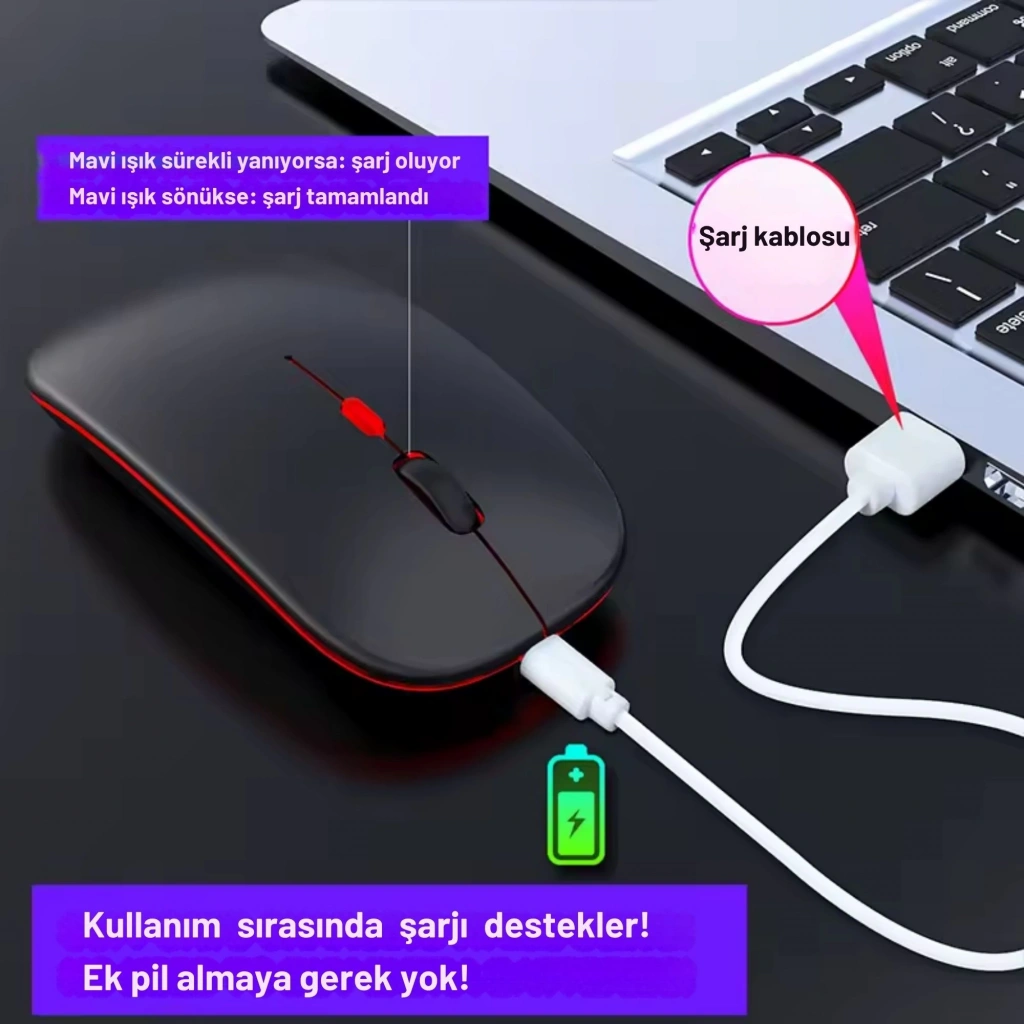 Ürün Açıklaması SHOPYTECH şarjlı kablosuz mouse; Bluetooth 5.2 + 2.4G çift mod bağlantısı, sessiz tıklama, RGB ışık ve 500 mAh bataryasıyla hem ofiste hem evde maksimum konfor sağlar. USB alıcılı 2.4G modu ile masaüstünde tak-çalıştır performans, Bluetooth modu ile MacBook, iPad, tablet ve telefonlarda kablosuz özgürlük sunar. Ayarlanabilir 800/1200/1600 DPI sayesinde bir tıkla hassasiyeti değiştirin; çizim yaparken hassas, internette gezerken hızlı olun. Ergonomik ince gövde bileği yormaz, sessiz mikro anahtarlar çevrenizi rahatsız etmez. Dahili batarya kullanım sırasında şarjı destekler, böylece pili bitince işiniz yarıda kalmaz. Şık RGB şerit aydınlatma masanıza modern bir dokunuş katar.
