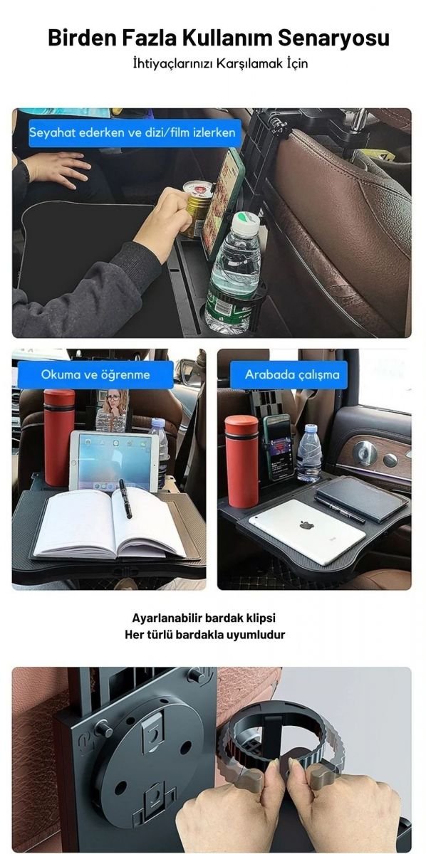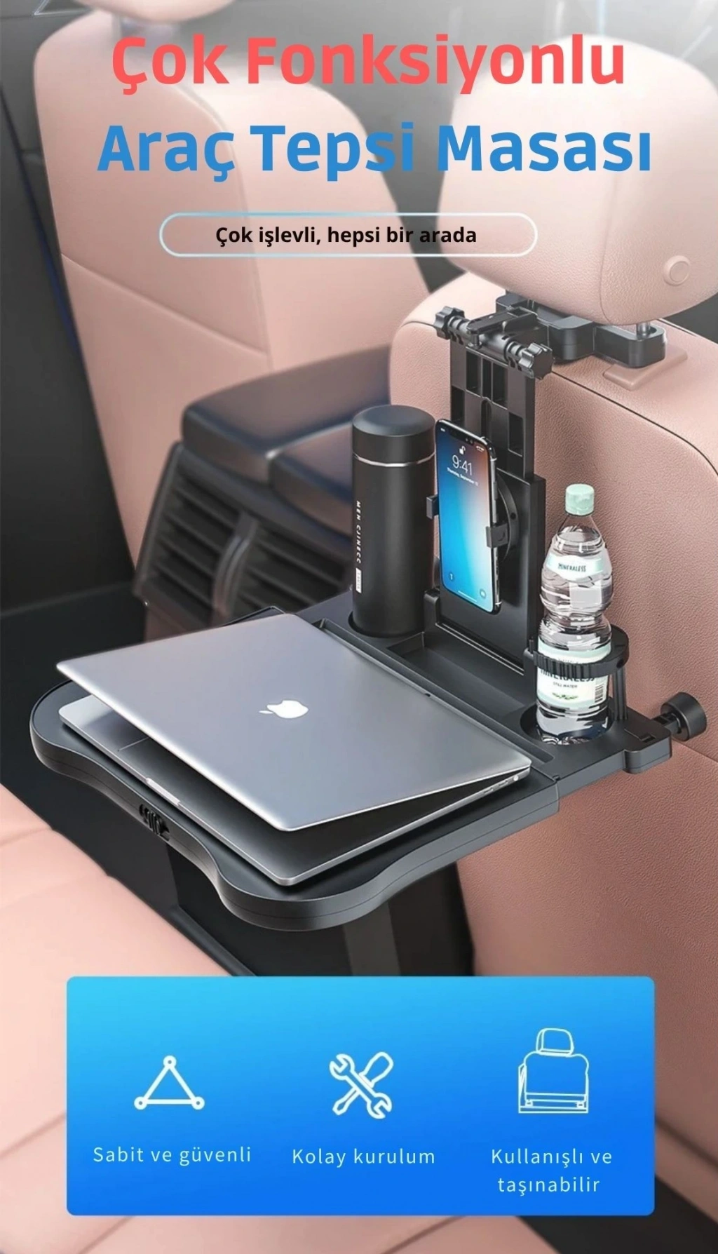 SHOPYTECH Evrensel Araç Koltuğu Masası 360° Döner Tepsi Tablet Laptop Standı ve Bardaklık SHOPYTECH çok fonksiyonlu araç tepsi masası, ön koltuk başlığına sabitlenerek arka koltukta konforlu bir çalışma ve yemek alanı oluşturur. Geniş ve ayarlanabilir masa yüzeyi; dizüstü bilgisayar, tablet, kitap, atıştırmalık ve oyuncaklar için ideal alan sunarken, bardaklık ve telefon tutucu sayesinde içeceğiniz ve ekranınız da her zaman güvenli bir konumda kalır. Üçgen destek yapısı ve metal başlık bağlantısı; ani fren, kasis ve bozuk yollarda bile masayı sabit ve sarsıntısız tutar. Uzun yolculuklarda çocuklar için yemek masası, yetişkinler için mobil ofis ya da dizi/film izleme standı olarak kullanabileceğiniz pratik bir araç içi çözümdür. • ÜÇGEN DESTEK YAPISI – SABİT VE GÜVENLİ