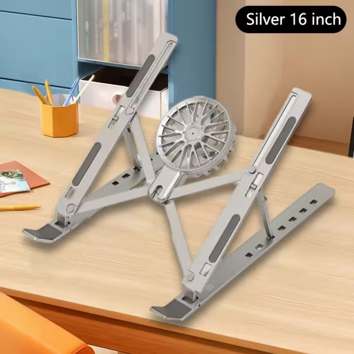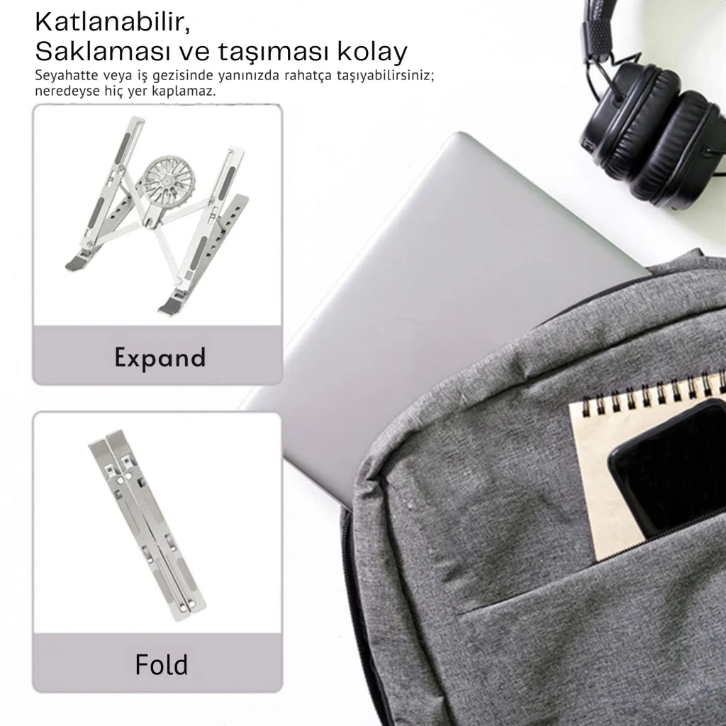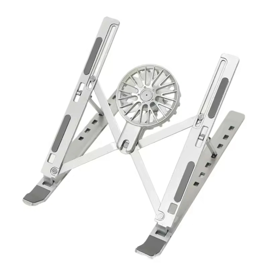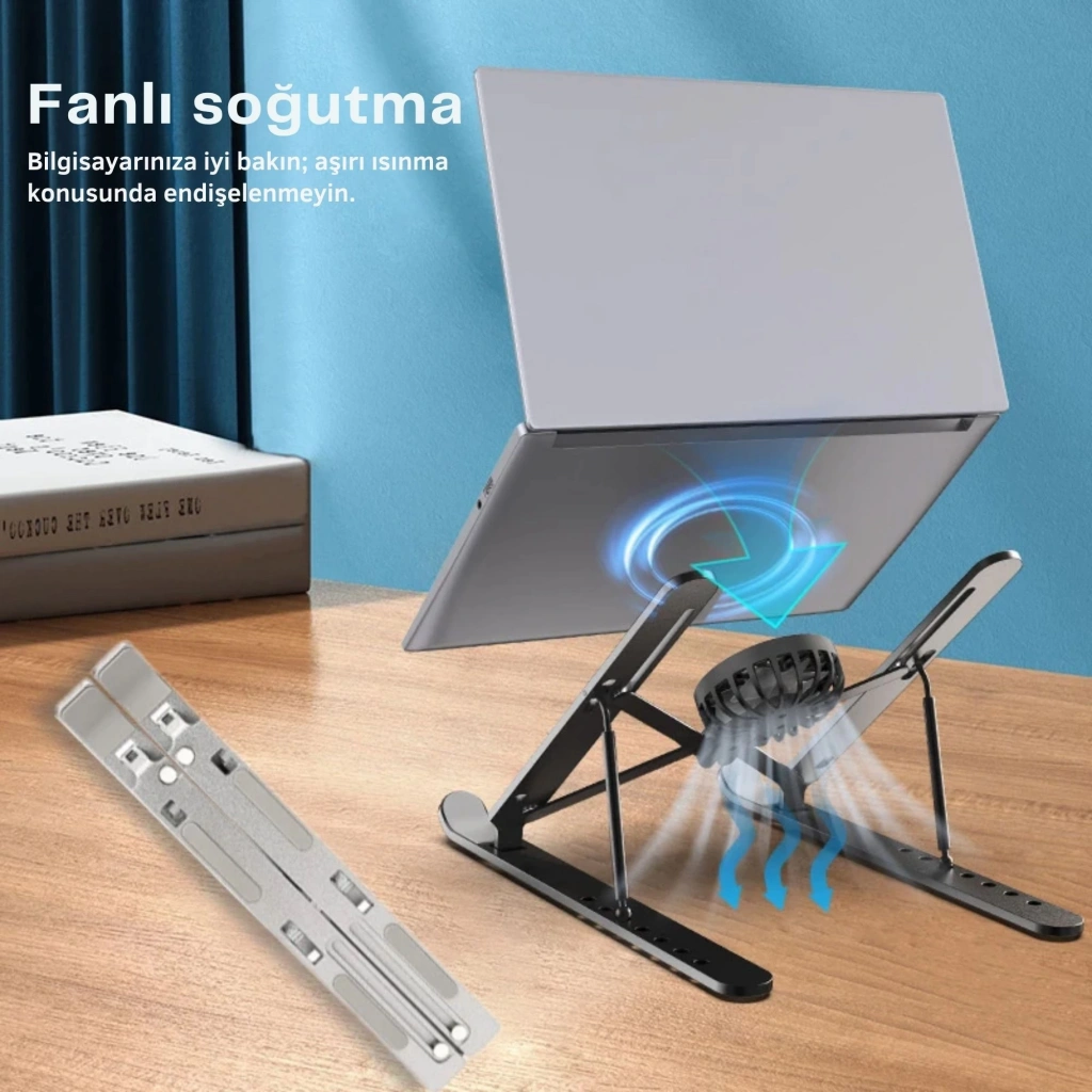 SHOPYTECH Fanlı Katlanır Laptop Standı 7 Kademeli Yükseklik Alüminyum Alaşım 16″ inc Uyumlu SHOPYTECH fanlı laptop standı; soğutucu + stand kombinasyonuyla dizüstünüzü serin ve ergonomik tutar. Üçgen alüminyum alaşım gövde, geniş silikon pedler ve katlanır-kompakt tasarım ile hem masada hem de mobil çalışmada sağlam destek sağlar. 16″e kadar laptop ve tabletlerle uyumludur; ofiste, evde, kafede veya kütüphanede kolayca taşıyıp kurabilirsiniz. • TURBO FANLI SOĞUTMA: Alttan yönlenen güçlü hava akımı aşırı ısınmayı azaltır; performans ve batarya ömrünü destekler.
