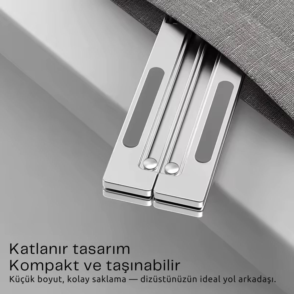 • ALÜMİNYUM ALAŞIM + SİLİKON PEDLER: Sağlam üçgen yapı; cihazı ve masayı çizmeyen kaymaz geniş pedler.