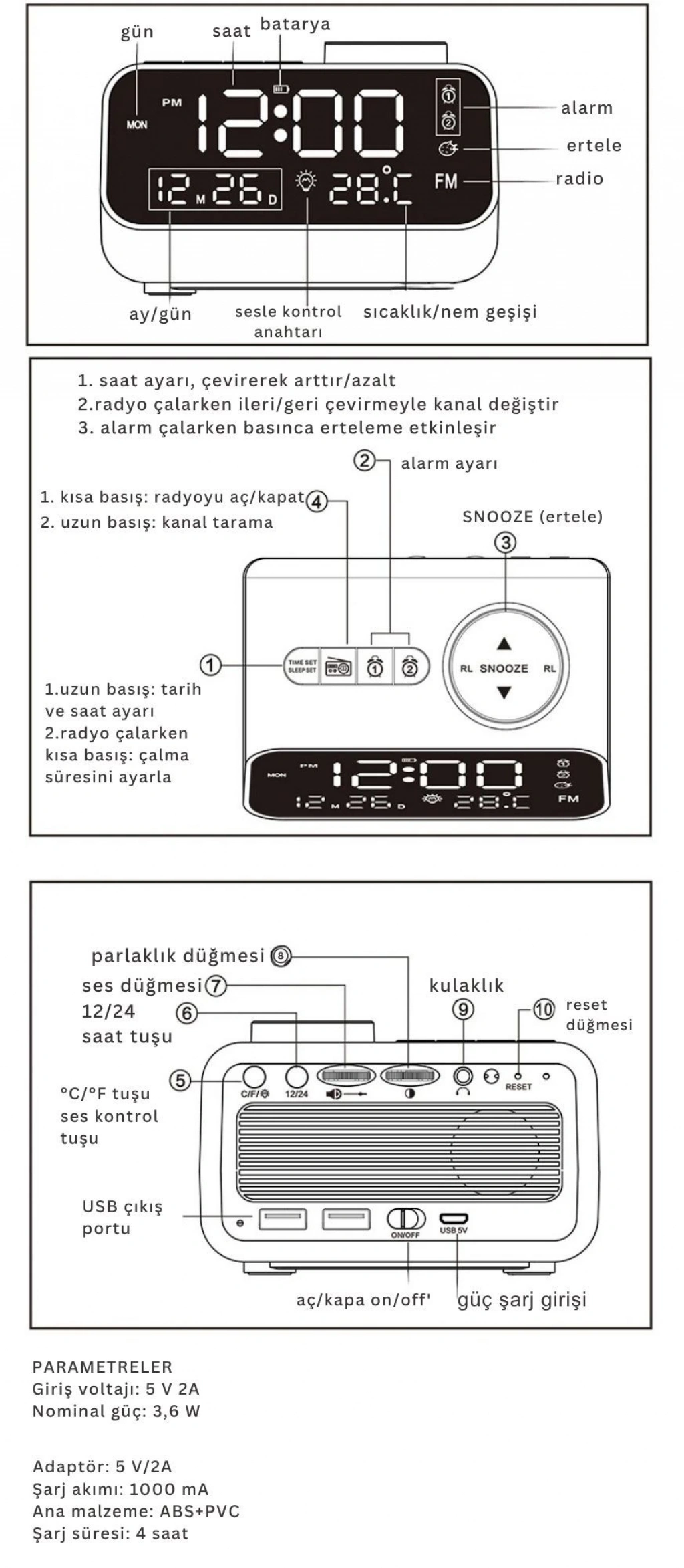SHOPYTECH FM Radyo Dijital Çalar Saat LED Ekranlı Masa Saati Sıcaklık Nem göstergesi 2 USB Şarj Çıkışı Siyah,Beyaz Uzaktan da net okunabilen LED ekranıyla zamana, takvime ve ortamdaki sıcaklık/nem değerlerine tek bakışta hâkim olmanızı sağlar. FM radyo, çift alarm (radyo veya melodi),sesle/tuşla uyanan arka ışık ve ayarlanabilir parlaklık ile geceleri rahatsız etmez; iki USB çıkışıyla telefonunuzu/tabletinizi şarj eder. Şarj edilebilir pil + DC güçle çalışır; kesinti olsa bile saat/alarm hafızası korunur. ÖNE ÇIKANLAR