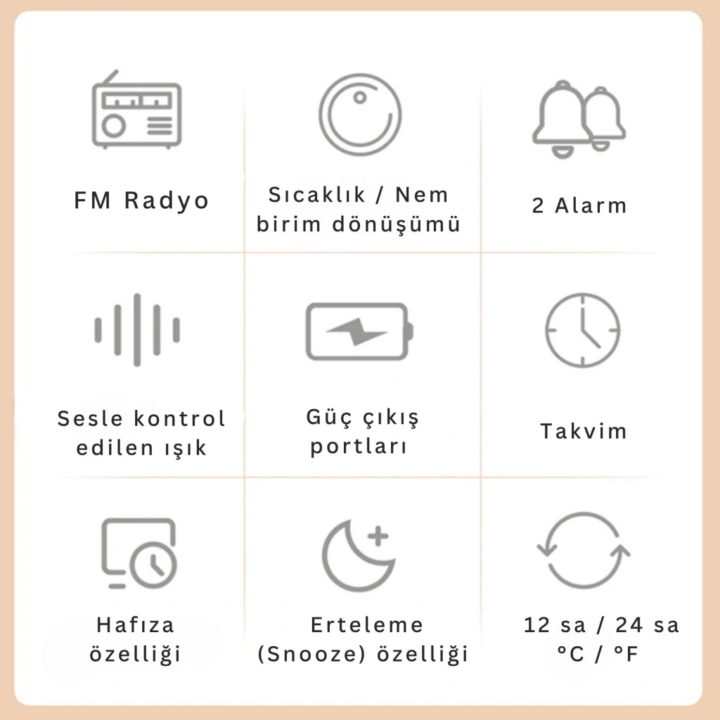 Çift Alarm & Snooze: 2 ayrı alarm kurun; erteleme (Snooze) ile kademeli uyanın. Alarm sesi radyo veya dahili melodilerden seçilebilir, ses seviyesi ayarlanabilir.
