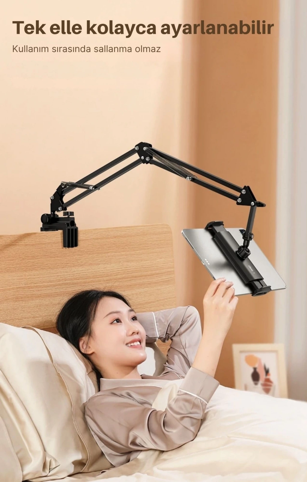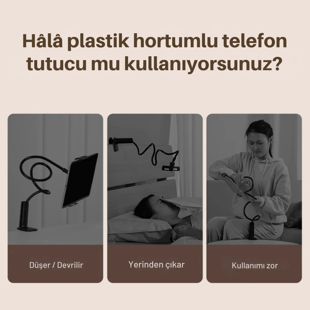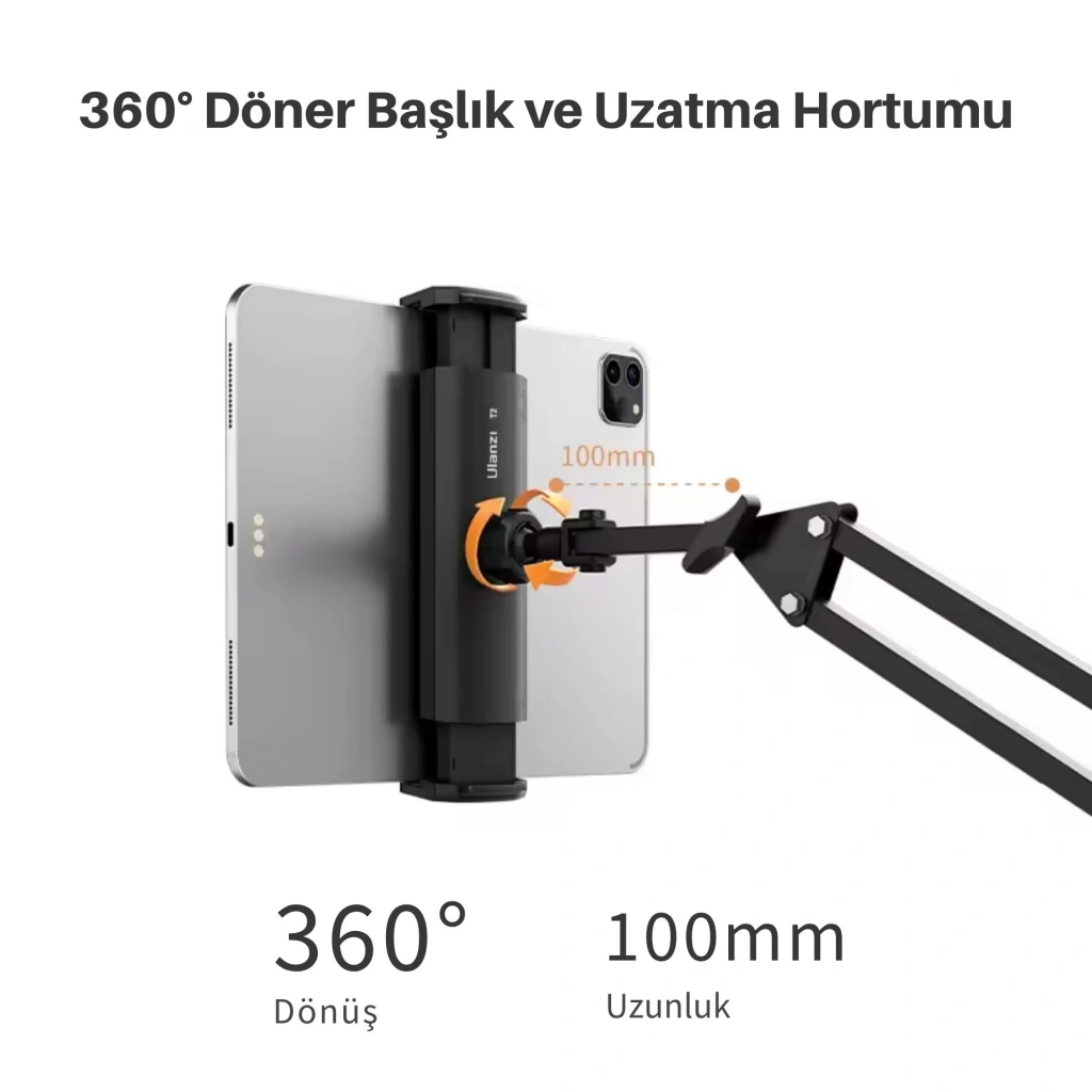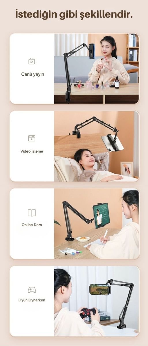 SHOPYTECHT2 metal 360° uzun kol tutucu, telefonu/tableti masaya veya yatak başına kelepçeyle sabitleyip eller serbest kullanım sağlar. Karbon çelik üçgen kol 2 kg’a kadar stabil taşıma sunar; 360° döner başlık ve 100 mm uzatma parçası ile dikey/yatay hızlı geçiş yapılır. 4.6–12.9″ cihazlarla uyumludur; iPad Pro/Air/mini, Galaxy Tab ve akıllı telefonlar için idealdir. Pedli kelepçe 40 mm’ye kadar yüzeylere iz bırakmadan sıkılır, gövde boyunca kablo yolu ile şarj kabloları gizlenir. Canlı yayın, üstten (overhead) çekim, çevrim içi ders, yemek tarifi takip, oyun ve yatakta video izleme gibi onlarca senaryoda titreşimsiz ve güvenli çözüm sunar. • KABLO YÖNETİMİ & TEMİZ GÖRÜNÜM: Gövde boyunca yer alan kablo yolu sayesinde şarj kabloları gizlenir, masa ve komodin üzerinde düzenli bir kurulum sağlanır.