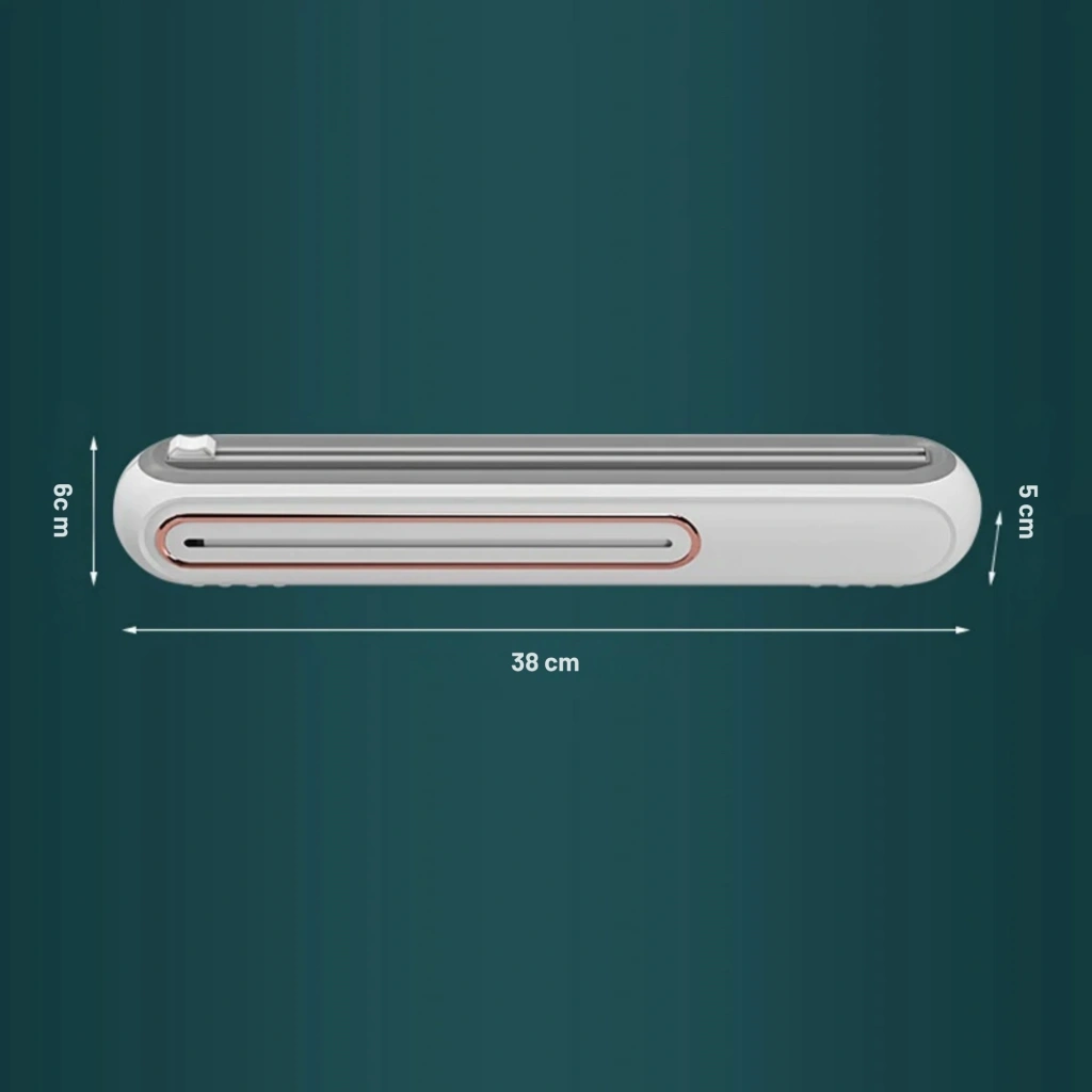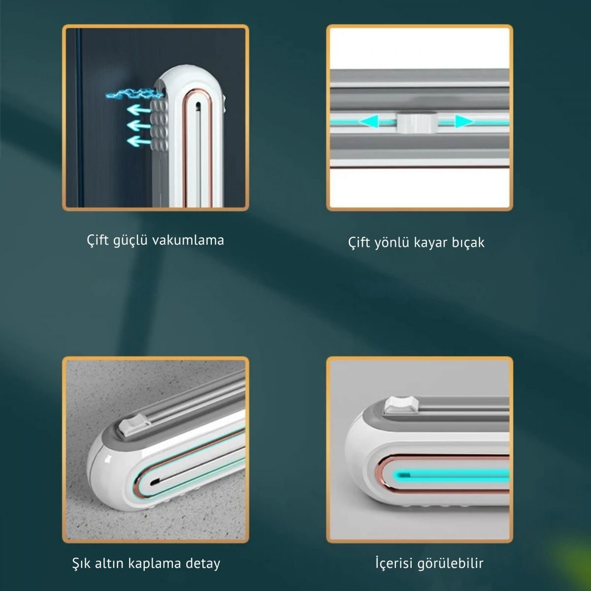 SHOPYTECH Mıknatıslı Streç Film Folyo Yağlı Kağıt Dispenseri Çift Yönlü Bıçaklı 30 cm Rulo Kesici SHOPYTECH mıknatıslı streç film dispenseri, streç film, pişirme kâğıdı ve alüminyum folyoyu saniyeler içinde düzgünce kesip saklamanızı sağlar. Alt kısmındaki güçlü mıknatıslar ve mini vantuzlar sayesinde buzdolabına veya metal dolaplara sıkıca tutunur; tezgâha koyarak da kullanabilirsiniz. 30 cm’e kadar çoğu ev tipi rulo ile uyumlu çift yönlü kayar bıçak, filmi takılmadan ve yamulmadan keser, parmak kesilmesi riskini ortadan kaldırır. Şık altın detaylı kompakt gövde ise modern mutfaklara dekoratif bir dokunuş katar. • GÜVENLİ & PÜRÜZSÜZ KESİM