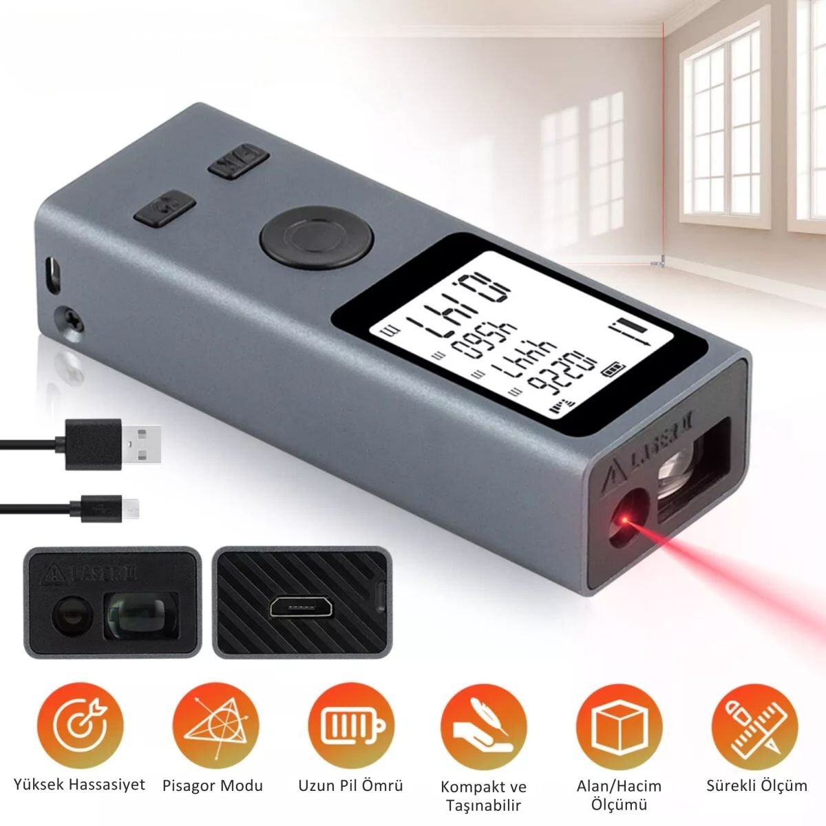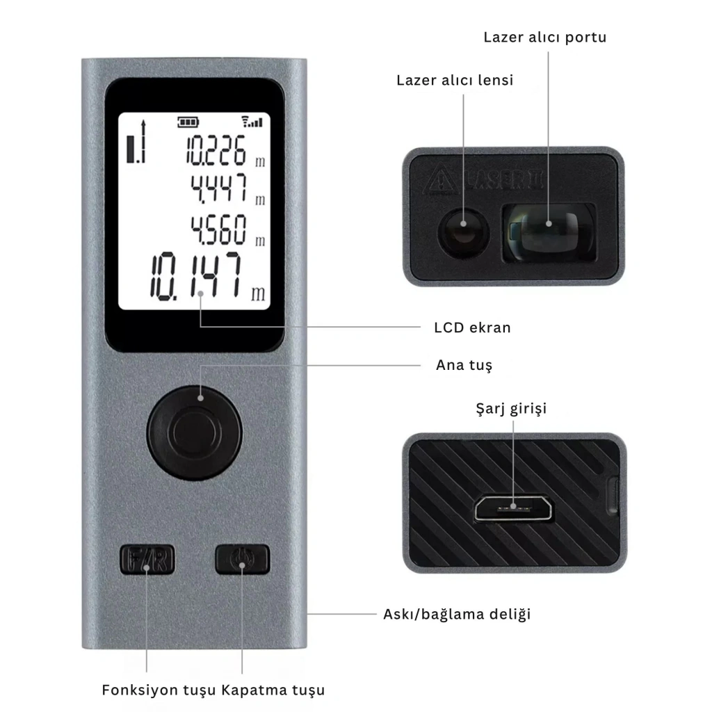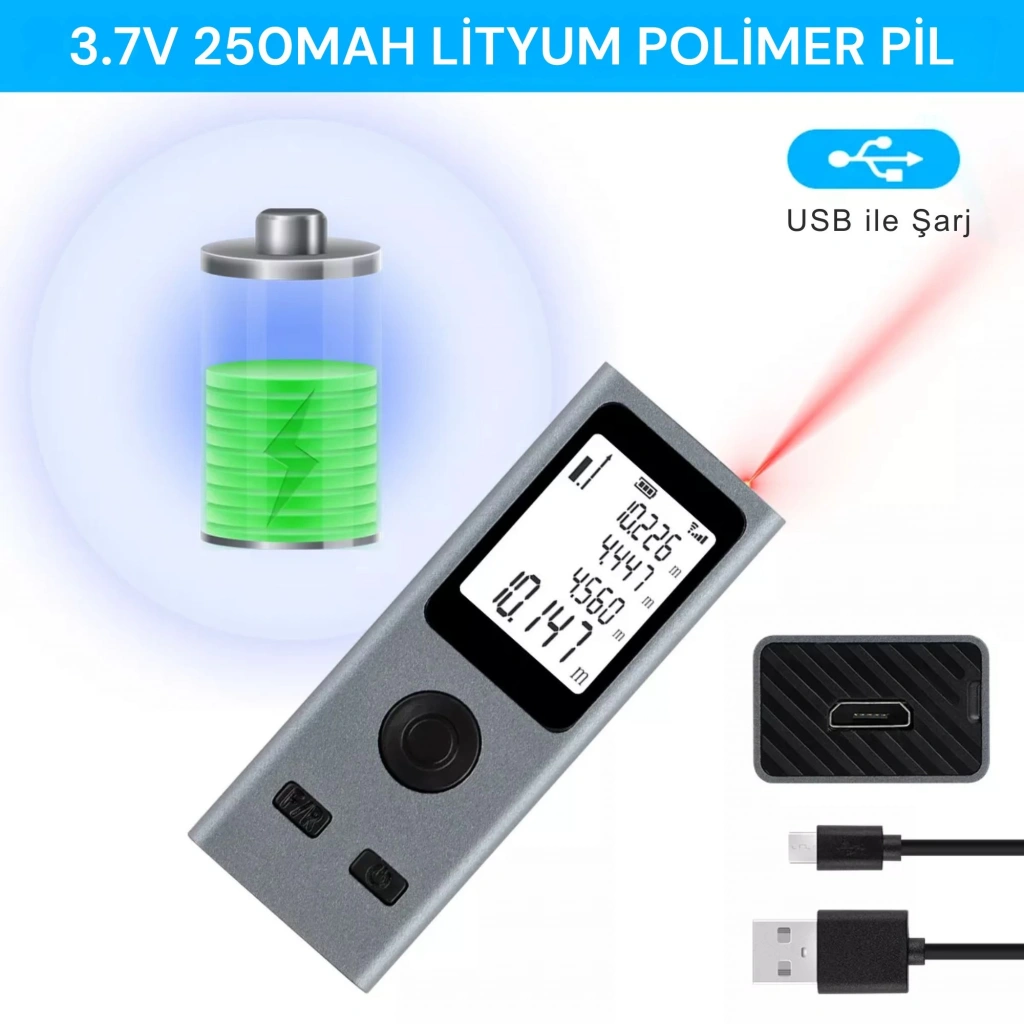 SHOPYTECH Mini USB Şarjlı Lazer Metre 50 m Dijital Mesafe Ölçer Alan/Hacim Hesabı Pisagor Sürekli Ölçüm Avuç içi boyutundaki SHOPYTECH lazer metre; tadilat, mimari ölçüm, emlak keşfi ve DIY projelerde hızlı ve hassas sonuç verir. 3.7 V 250 mAh Li-Po batarya USB’den şarj olur; büyük LCD ekran, tek tuşla ölçüm ve çoklu modlar (alan/hacim, Pisagor, sürekli ölçüm) ile profesyonel doğruluk sağlar. 24 g’lık hafif gövdeyi anahtarlığınıza takıp her yere taşıyın. • YÜKSEK HASSASİYET: ±2 mm* doğrulukla 0.03–50 m aralığında güvenilir ölçüm.