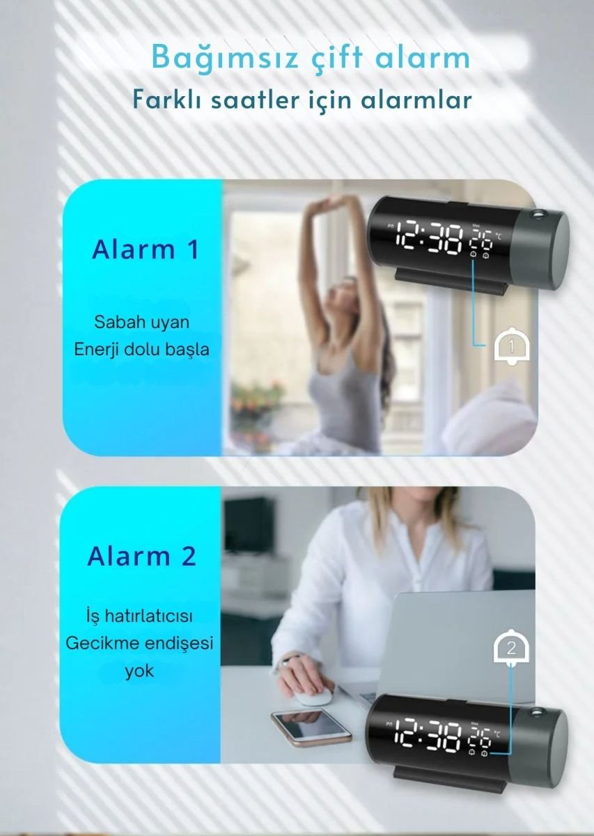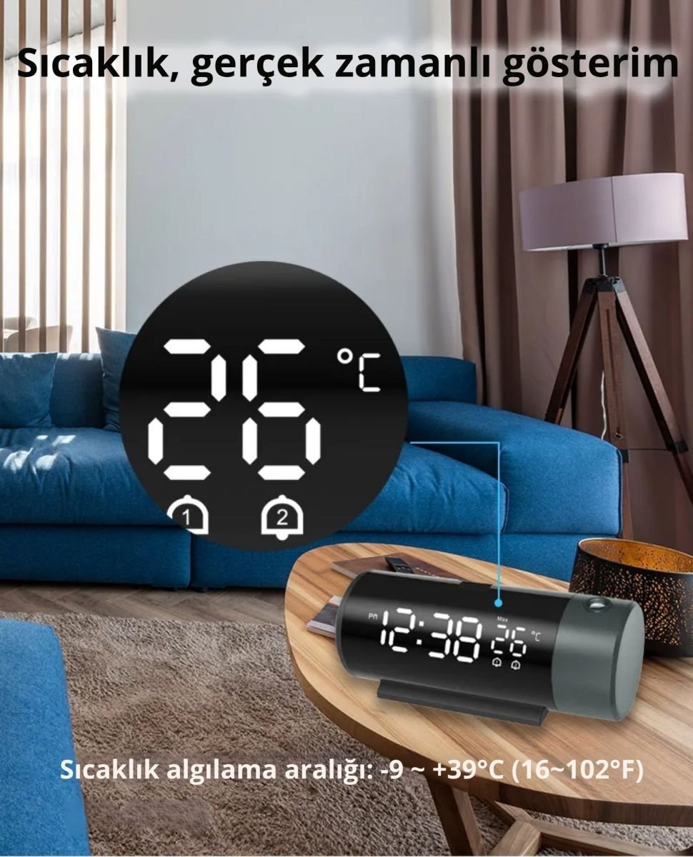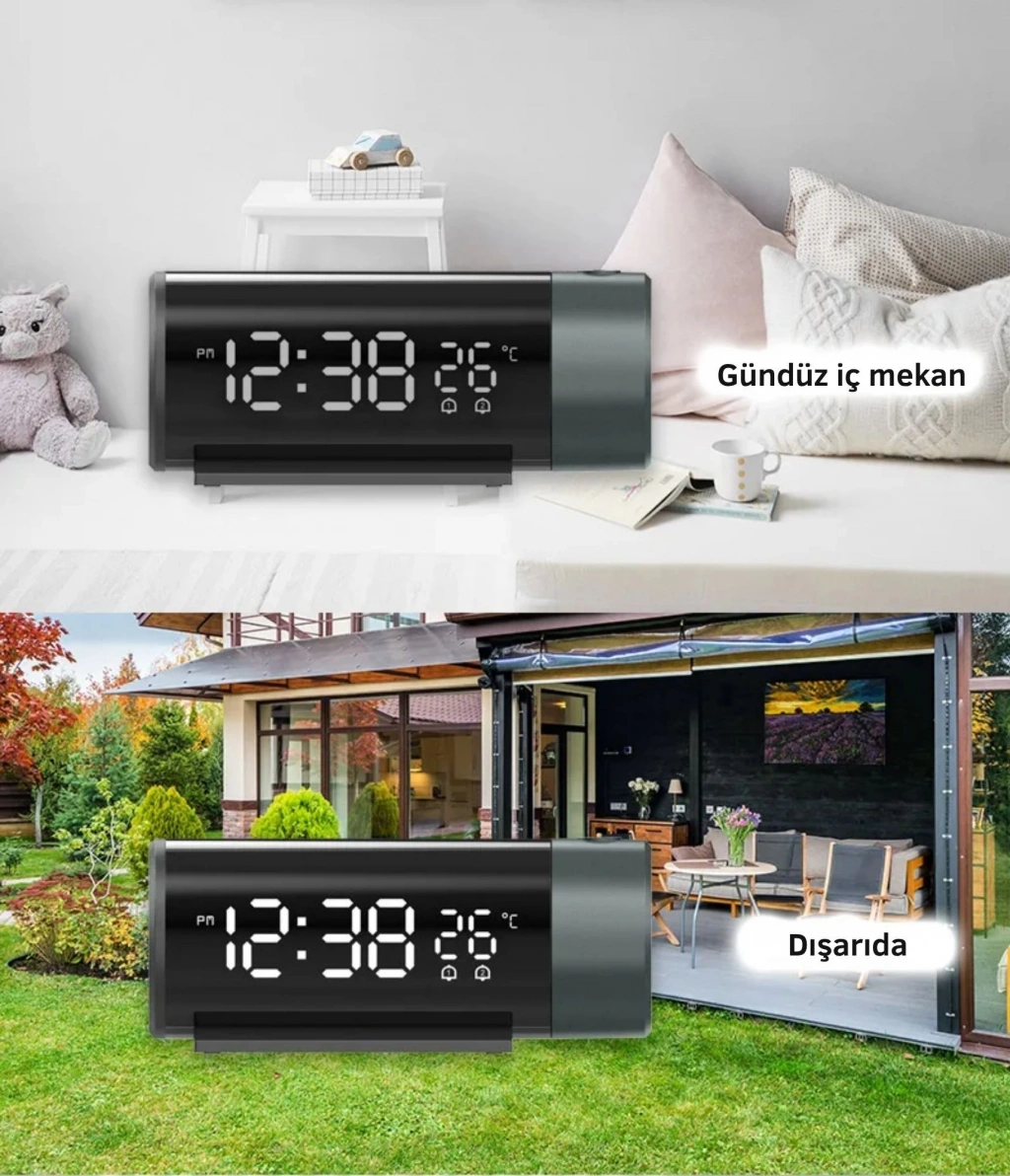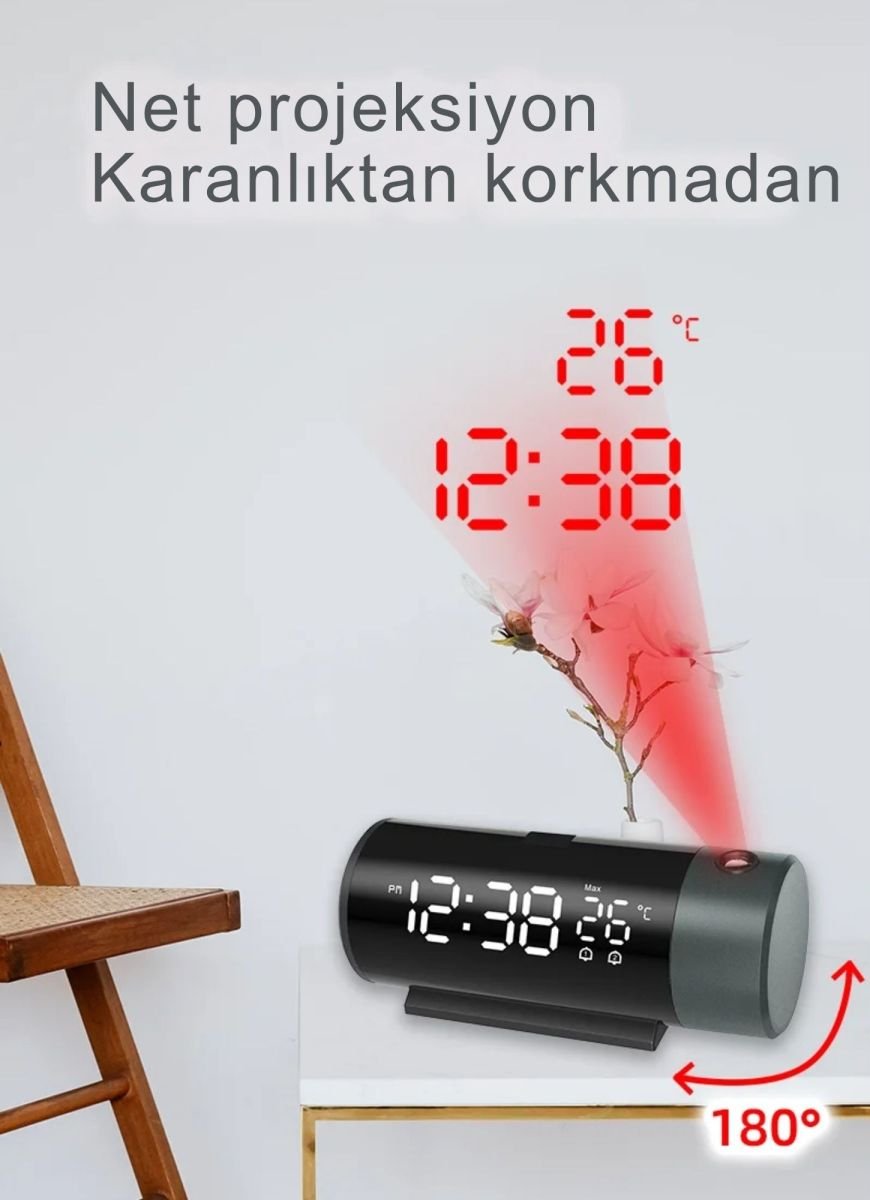SHOPYTECH Projeksiyonlu Dijital Çalar Saat Çift Alarm Termometre 180° Döner Kırmızı Projeksiyon Otomatik Parlaklık USB Telefon Şarjı Yatak odası, ofis ve çocuk odaları için tasarlanan bu LED projeksiyonlu saat; aynı anda saat + sıcaklığı duvara/tavana yansıtır. Işığa duyarlı ekran ortam parlaklığına göre otomatik kısılıp açılır. Çift bağımsız alarm ve ayarlanabilir erteleme (5–60 dk) ile güne programlı başlayın. Arka yüzdeki USB çıkış telefonunuzu şarj eder; CR2032 yedek pil yuvası (pil dâhil değil) ayarlarınızı elektrik kesilince de korur. • 180° DÖNER PROJEKSİYON & NET GÖRÜNÜRLÜK: Kırmızı projeksiyon 0,5–5 m mesafede duvar/tavana net yansıtma; gece saate uzanmadan zamanı görün.