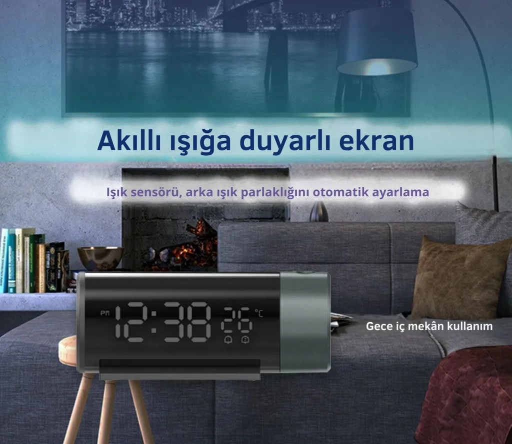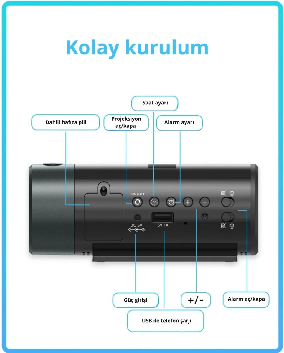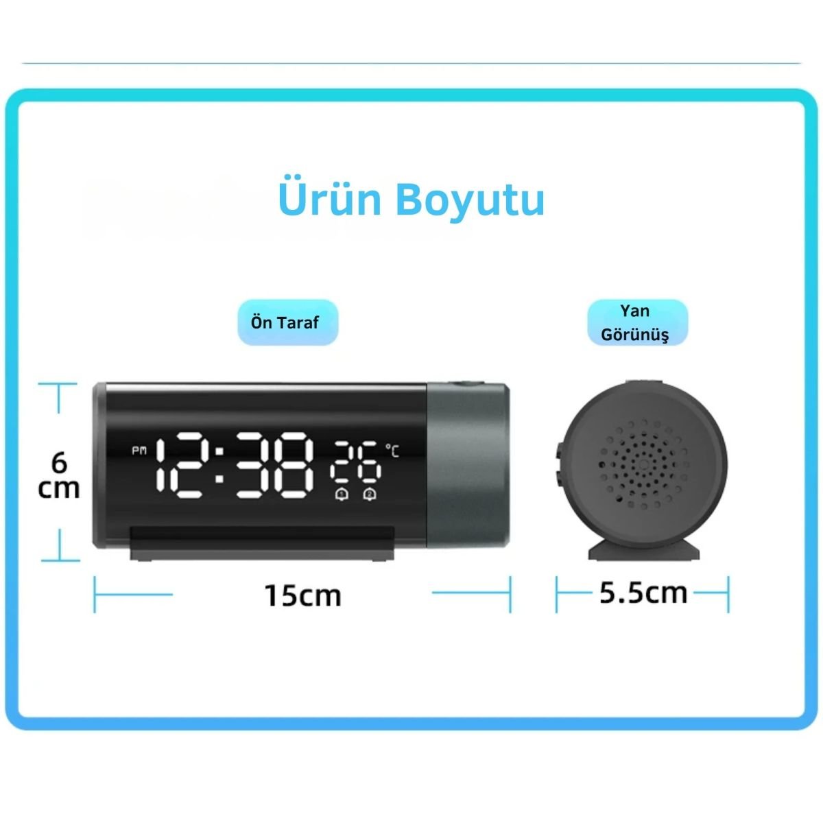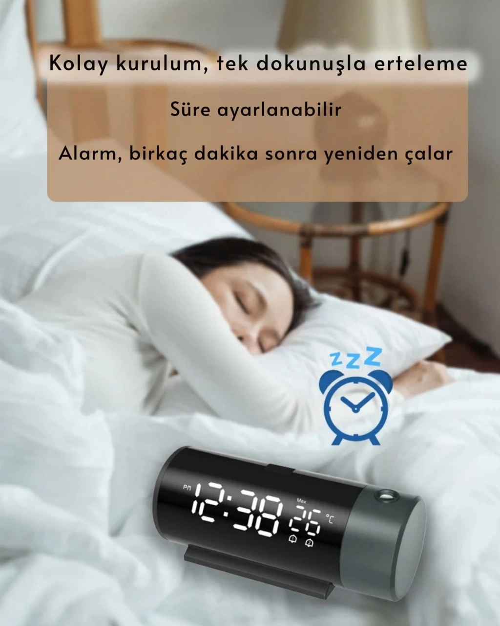 SHOPYTECH Projeksiyonlu Dijital Çalar Saat Çift Alarm Termometre 180° Döner Kırmızı Projeksiyon Otomatik Parlaklık USB Telefon Şarjı Yatak odası, ofis ve çocuk odaları için tasarlanan bu LED projeksiyonlu saat; aynı anda saat + sıcaklığı duvara/tavana yansıtır. Işığa duyarlı ekran ortam parlaklığına göre otomatik kısılıp açılır. Çift bağımsız alarm ve ayarlanabilir erteleme (5–60 dk) ile güne programlı başlayın. Arka yüzdeki USB çıkış telefonunuzu şarj eder; CR2032 yedek pil yuvası (pil dâhil değil) ayarlarınızı elektrik kesilince de korur. • 180° DÖNER PROJEKSİYON & NET GÖRÜNÜRLÜK: Kırmızı projeksiyon 0,5–5 m mesafede duvar/tavana net yansıtma; gece saate uzanmadan zamanı görün.