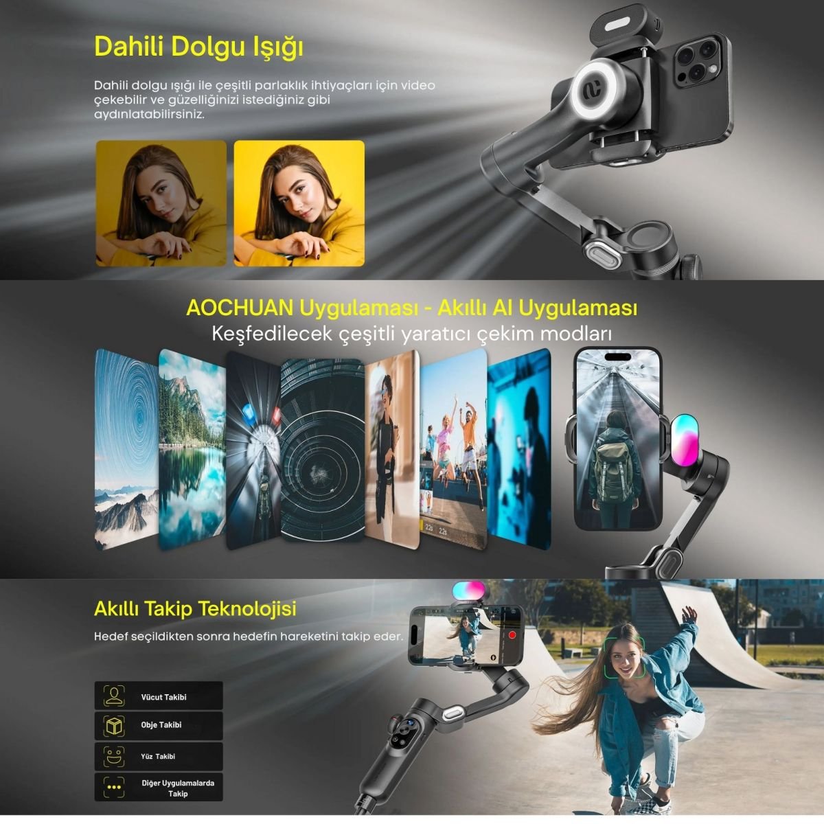 SHOPYTECH Smart X Pro Combo 3 Eksen Akıllı Telefon Gimbal Stabilizer (iOS & Android) SHOPYTECH Smart X Pro Combo; 3 eksenli sarsıntı engelleme, manyetik RGB dolgu ışığı ve uzatma çubuğu ile mobil çekimlerinizi profesyonel seviyeye taşır. Yapay Zeka 7.0 stabilizasyonu koşarken, yürürken ya da vlog çekerken akıcı görüntüler sağlar. OLED kontrol paneli, odak tekerleği ve zoom kaydırıcısı ile sinematik kontrol parmaklarınızın ucunda. Kablosuz ters şarj, değiştirilebilir pil ve kompakt taşıma çantasıyla içerik üreticileri, gezginler ve canlı yayıncılar için eksiksiz bir sette gelir.