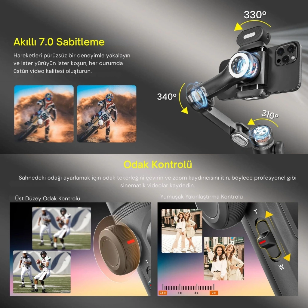 AI 7.0 Stabilizasyon (3 eksen): Pürüzsüz pan/tilt/roll hareketleri; profesyonel akıcılık.