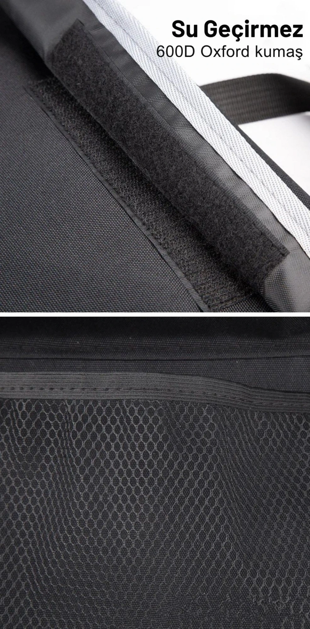 Kalın ve dayanıklı 600D Oxford kumaş, su sıçramalarına ve kirlenmeye karşı koruma sağlar. Nemli bezle kolayca silinebilir; bagajda taşınan sıvı, çamurlu ayakkabı veya market poşetlerinden gelebilecek kirleri tutarak koltuk döşemesini korur. Kenar bantları güçlendirilmiş dikişlidir, uzun süreli kullanımda sarkma ve yırtılma riskini azaltır.