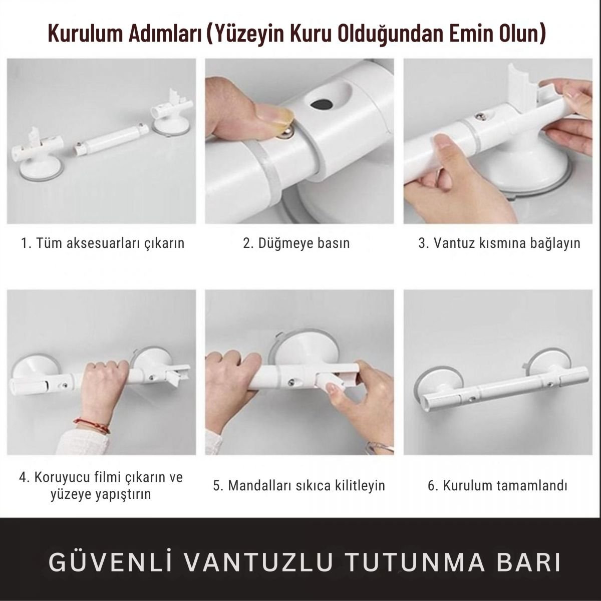 SHOPYTECH Vantuzlu Banyo Tutunma Barı Kaymaz Duş Tutma Kolu Emniyet El Rayı Yaşlı Çocuk Hamile Engelliler İçin Hareket Destek Kolu 35 cm Vantuzlu banyo tutunma barı; banyoda, duşa kabinde, küvette veya tuvalet yanında ekstra denge ve güvenlik sağlayan taşınabilir bir emniyet el rayıdır. Delme, vida ve yapıştırıcı gerektirmeyen güçlü vantuz tabanı sayesinde seramik fayans, cam, akrilik levha ve benzeri pürüzsüz yüzeylere 5 saniyede sabitlenir; kilitleme mandalları ve kaymaz çukur tutma yüzeyi ile yaşlılar, hamileler, çocuklar ve hareket kısıtlılığı olan kişiler için güven veren destek noktası oluşturur. ABS gövde ve büyütülmüş TPR vantuzlar, sıcak ve nemli ortamlarda dahi emiş gücünü korurken; ışıklı gösterge halkası tutunma barının yüzeye doğru sabitlendiğini hızlıca anlamanızı sağlar. Sökülüp tekrar kullanılabilen yapısıyla seyahatlerde, yazlıkta veya kiralık evlerde duvarı delmeden banyo güvenliğini artırmak için ideal çözüm sunar. • GÜVENLİ VANTUZLU TUTUNMA BARİYERİ: Geniş tabanlı 2 adet güçlü vantuz ve vakumlu kilit sistemiyle düz, gözeneksiz yüzeylere sıkıca tutunur; banyo ve duşta kayma riskini azaltmak için ek destek sağlar.
