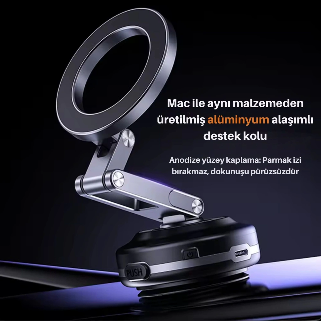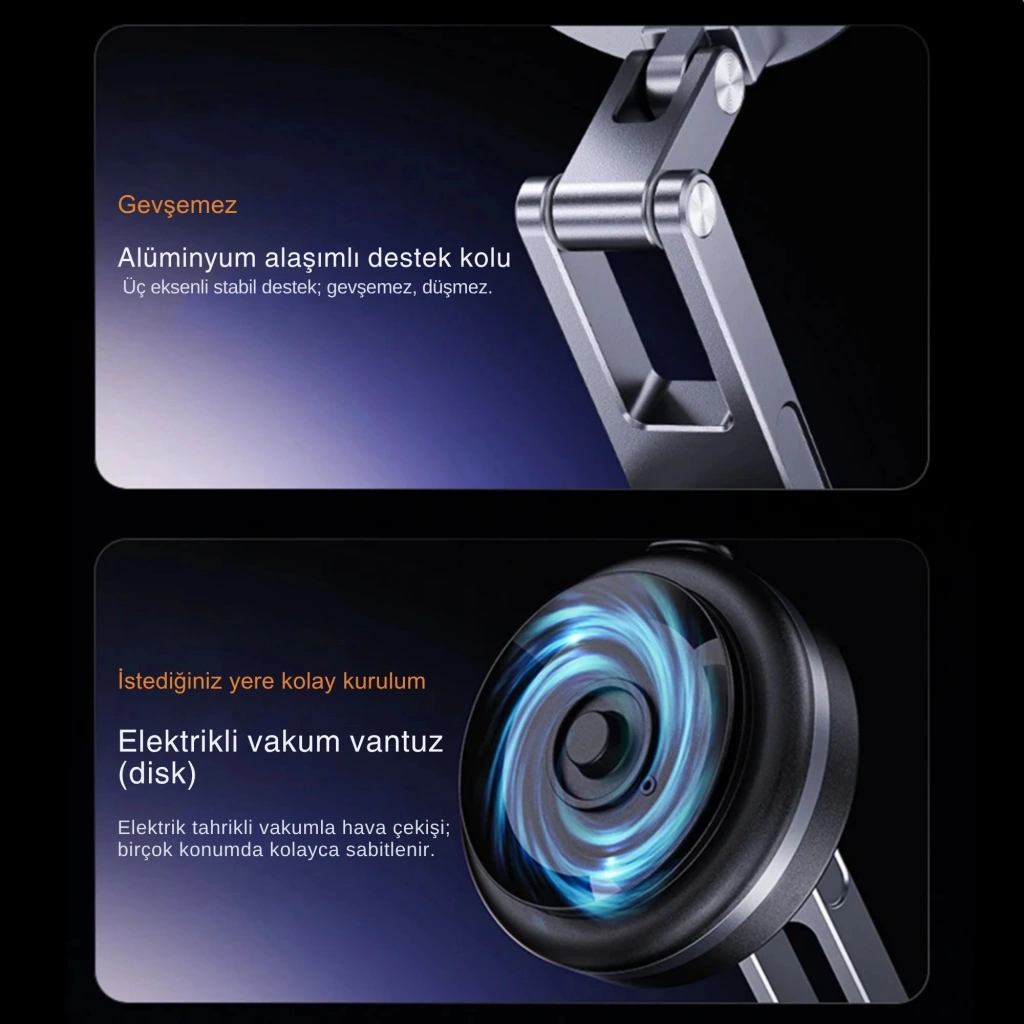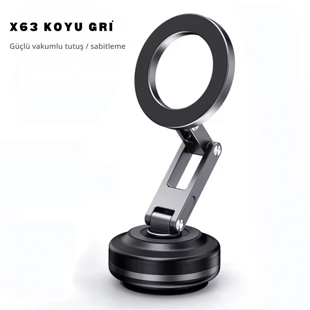 SHOPYTECH X63 Alüminyum Alaşımlı Manyetik Araç Telefon Tutucu 360° Çok Eksenli Vakum Tabanlı Type-C Şarjlı SHOPYTECH X63; alüminyum alaşımlı kol ve elektrikli vakum vantuz tabanı ile aracınıza zarar vermeden güçlü ve stabil tutuş sağlar. Üç eksenli katlanır mekanizma 360°/180° ayarlara izin verir; ekranı tek hareketle yatay-dikey çevirip ideal görüş açınızı yakalarsınız. Kompakt gövde sayesinde torpidoda, ön panelde veya camda yer kaplamaz; ofis masası ve banyo fayansı gibi düz zeminlerde de kullanılabilir. • GÜÇLÜ MANYETİK TUTUŞ: Yüksek mıknatıs gücü ile telefonu sabit tutar; bozuk yolda bile sallanmayı azaltır.